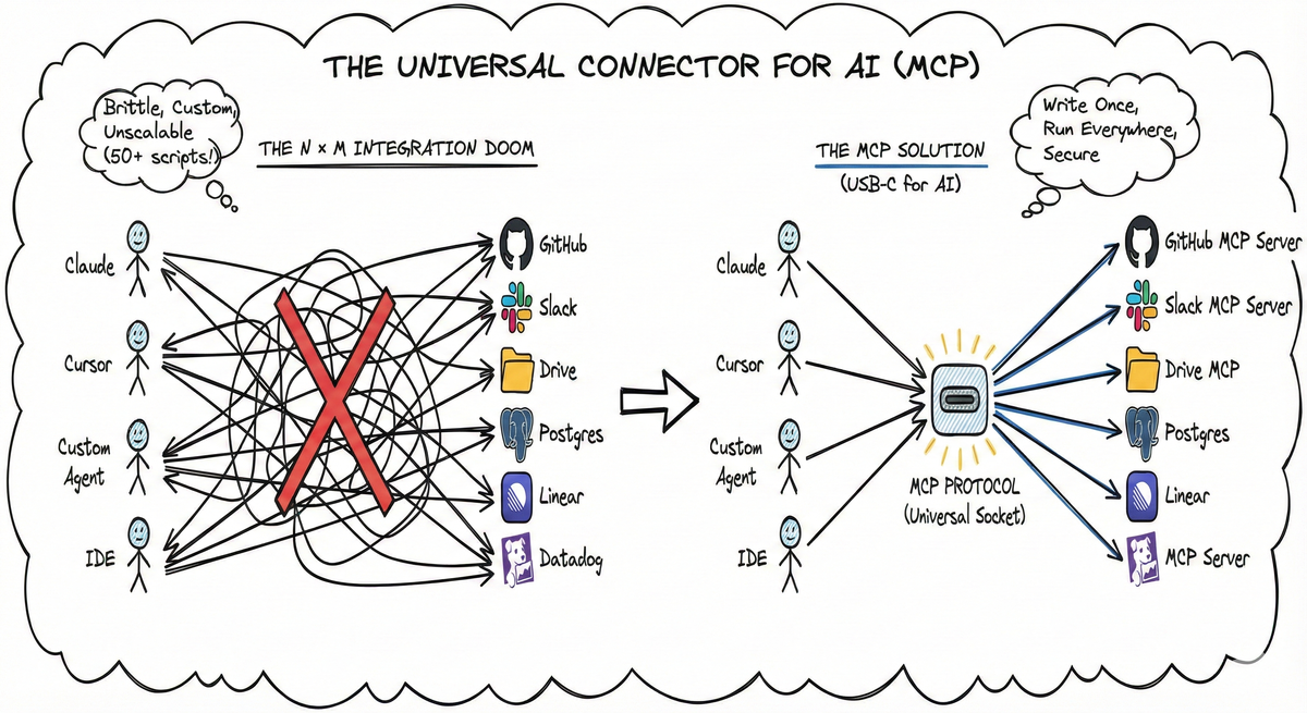 TL;DR: Building AI agents today feels like writing printer drivers in the 90s. We face an N × M integration problem where every AI app needs a custom connector for every data source. MCP (Model Context Protocol) solves this by acting as a universal open standard—effectively the USB-C for AI applications.