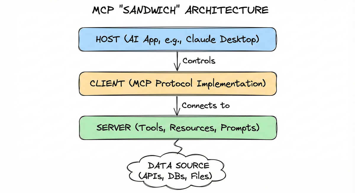 TL;DR: MCP isn’t just a pipe; it’s a specific architectural pattern consisting of Hosts, Clients, and Servers. This post unpacks the “Sandwich Architecture” that allows AI agents to safely connect to local and remote resources.