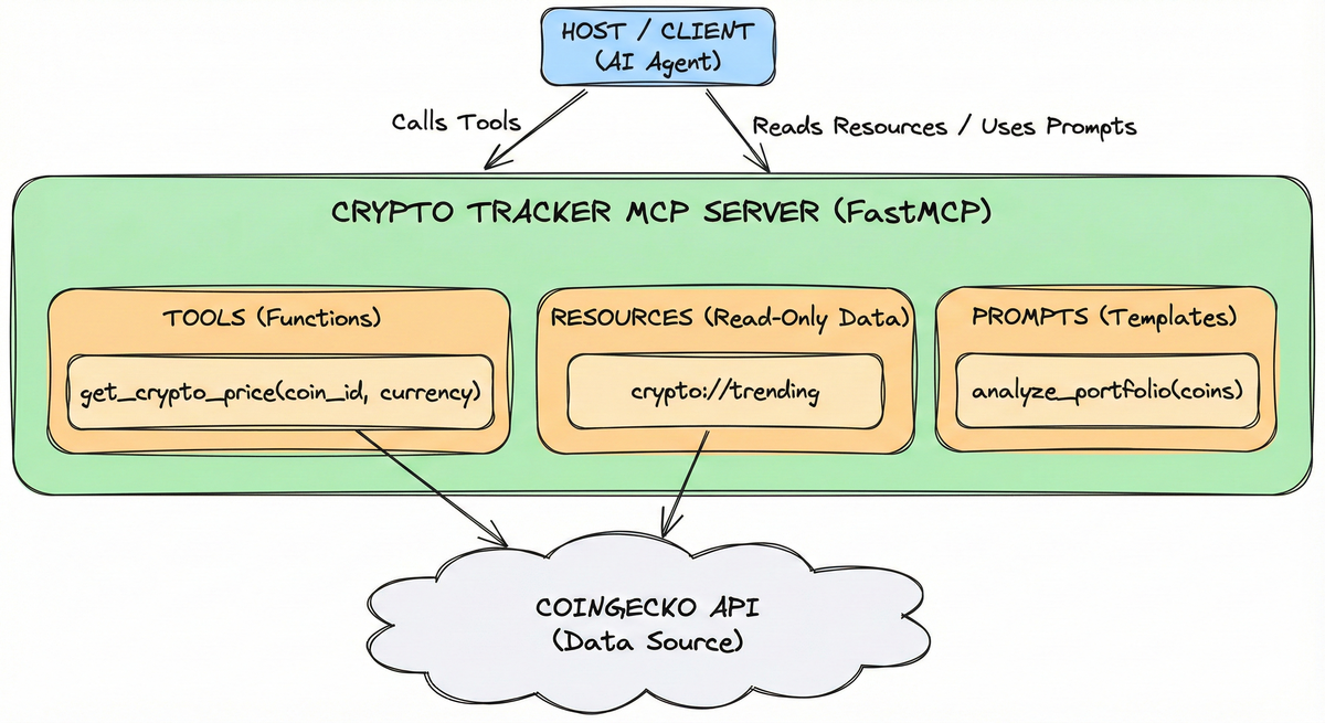 TL;DR: In this part, we stop talking theory and write code. We will build a fully functional Crypto Tracker MCP Server using FastMCP. It connects to the real CoinGecko API, exposes live market data as Resources, lets the AI fetch prices via Tools, and includes a “Financial Analyst” Prompt.